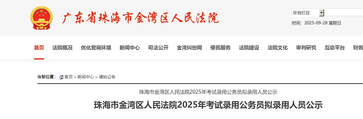 【2025广东珠海市金湾区人民法院考试录用公务员拟录用公示(3人)】相关岗位: